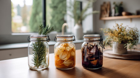 Infused Water in glass jar Fermented from herb, vegetable, and fruit.Having Enzyme and Probiotic. Good effects on physical health.Concept of healthy drinks that come from nature.