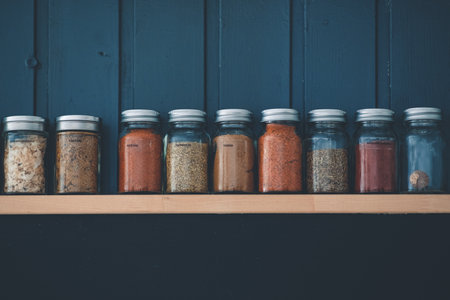 A row of glass jars filled with assorted spices displayed on a rustic wooden shelf. Ideal for culinary themes, showcasing diverse flavors and natural ingredients.
