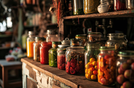 Homemade jams in vintage jars on a rustic shelf in a cozy kitchen setting