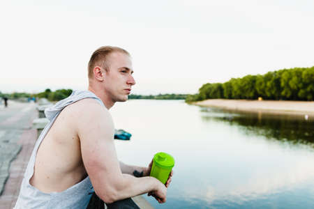 sport man standing after running and holding water bottle drink. Sport thirsty and resting after exercise.