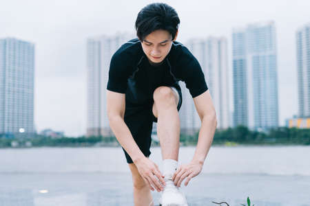 Young fitness athlete man running on road track, exercise workout wellness and runner tying shoelaces with copy space before run.