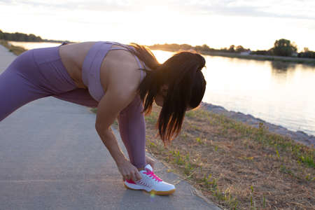 young cute woman is doing stretching on a harbor quay in the morning - health and wellness concept