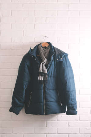Blue men's jacket on white brick wall