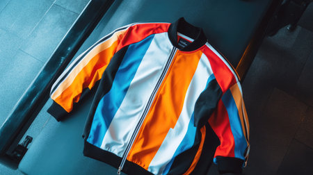 A sporty track jacket with bold stripes, lying on a gym bench, ready for a workout -