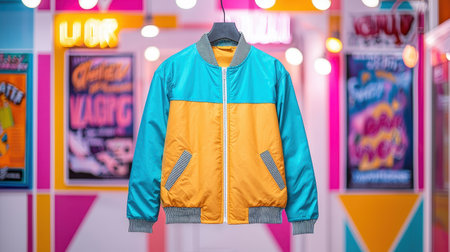 vibrant image of 90s windbreaker jacket hanging in colorful setting.