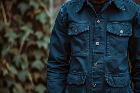 Close-up of a man wearing a stylish blue denim jacket with blurred greenery in the background