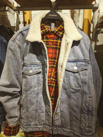 Denim jacket with fur hanging on a hanger