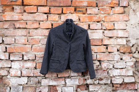 black womens blazer with polka dots hanging on a brick old wall outside in the sun