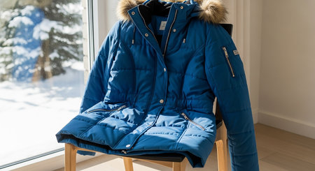 A warm puffer jacket displayed on a mannequin, ideal for showcasing winter fashion in a retail setting