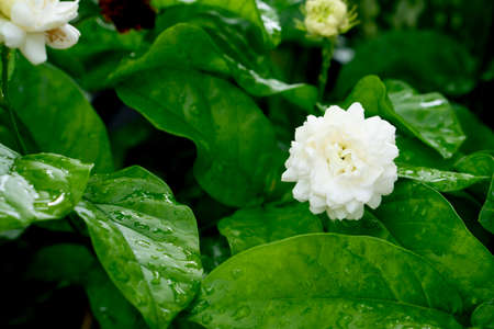 White flower, Jasmine (Jasminum sambac L.) with water droplets and green leaves blurred background