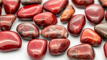 A captivating array of vibrant red polished stones displayed on a clean white background, showcasing their unique textures and rich colors. Ideal for natural decor or healing practices, these gems highlight beauty and artistry in mineral form.