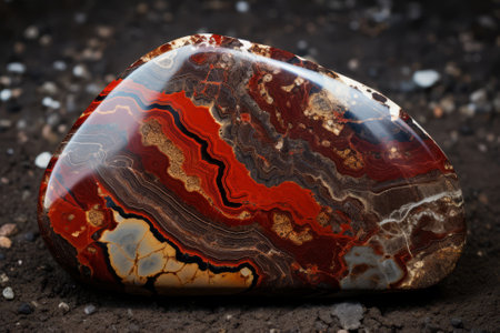 a stone sitting on rocks, showcasing dark amber and red hues with bold lines and vivid colors. the photorealistic detailing captures the iridescence and opalescence of the stone. the scene depicts romantic riverscapes with flicker effects, creating an enchanting atmosphere. the combination of orange and black adds depth and contrast to the composition. ai generated