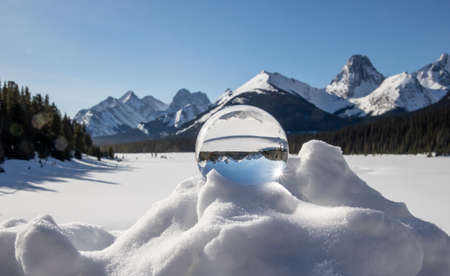 A lens ball perched on a snow bank with a scene of a snow peaked mountain range.