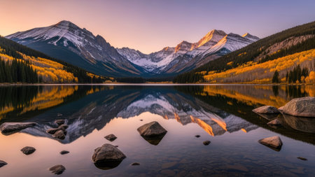 A picturesque sunset scene featuring a tranquil lake reflecting snow capped mountains and a coniferous forest.