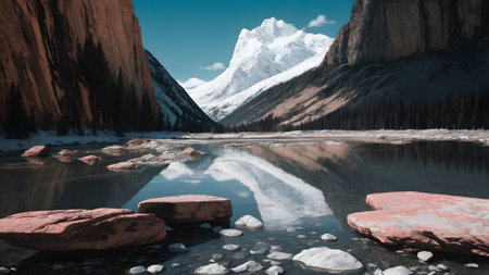 Mountain lake with reflection of snow-capped peaks in the water