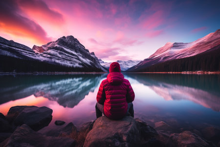 Unrecognizable person sitting on a rock by a lake in National Park, Canada at epic pink sunset