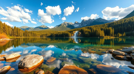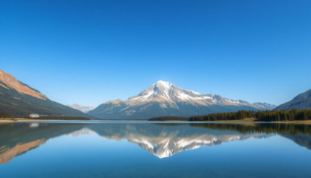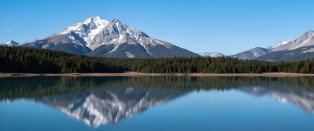 A stunning mountain landscape with a serene lake reflecting the majestic peaks and lush forests under a bright blue sky, ideal for nature enthusiasts.