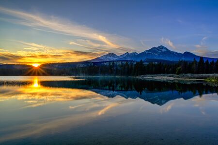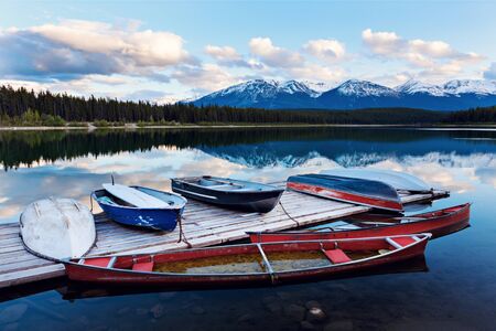 Pyramid Lake sunset time. Jasper National Park landscape. Canadian Rockies nature scenery background. Alberta, Canada.