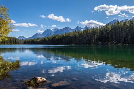 Calm blue water of Herbert Lake with reflections of trees, clouds, and the Canadian Rockies, Banff National Park, Alberta, Canada