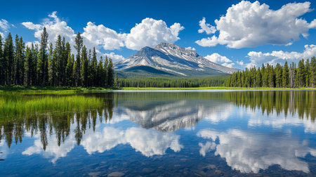 A stunning mountain landscape with a serene lake reflecting the majestic peaks and lush forests under a bright blue sky, ideal for nature enthusiasts.