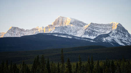 Massive rocky mountain catching the first sun rays on a cold winter morning, wide, Banff NP, Canada