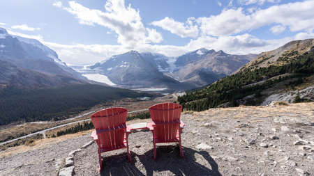 Two red chairs overlooking beautiful view on alpine valley with mountains and glaciers,Jasper,Canada