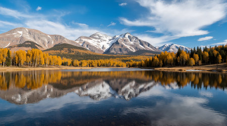Calm lake reflecting mountains and golden trees