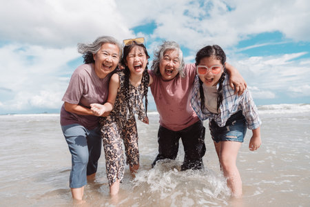Happy Asian family generations laughing on the beach. elderly women, daughter, and a kid embracing joy, health and lifestyle.