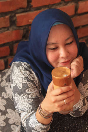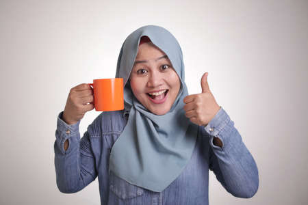 Portrait of happy young beautiful Asian muslim woman smiling, drinking tea or coffe during coffee break