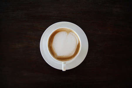 Top view of hot coffee cappuccino latte cup with saucer on wood texture abstract background.