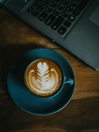 Beautiful a blue cup of hot cappuccino coffee with latte art on wooden coffee table, selective focus for drink background