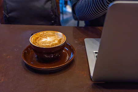 Closeup latte art coffee in white cup and laptop on table made of stone with Circle pattern