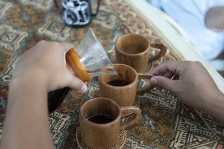 women Holding coffee cup, wooden table cafe while having coffee