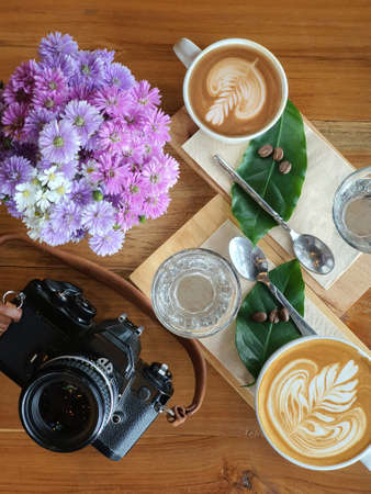Coffee latte art on the wood desk in coffee shop cafe. Blurred background.
