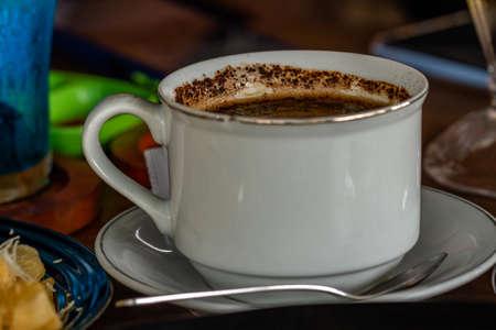 The hot cappuccino cup, decorated with milk foam and sprinkled with coffee powder, gives a very pleasant feeling to drink with copy space