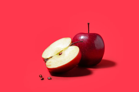 Fresh red apple with piece and seeds on color background