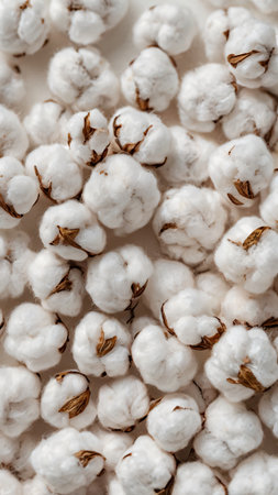 Close up of natural cotton branches with soft white bolls, showcasing the delicate fibers and organic texture. Ideal for themes of natural textiles, comfort, and sustainable materials.