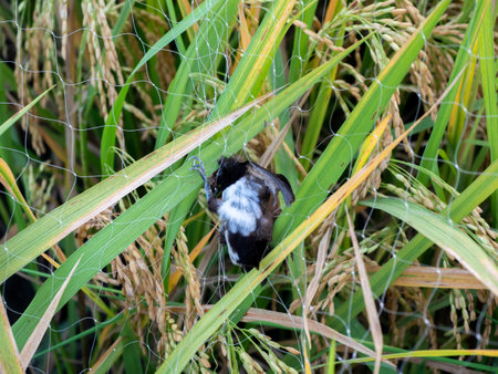 Spider in the paddy rice field, A bird died when caught in a net in a rice field, because it wanted to eat the rice and got caught in the net.