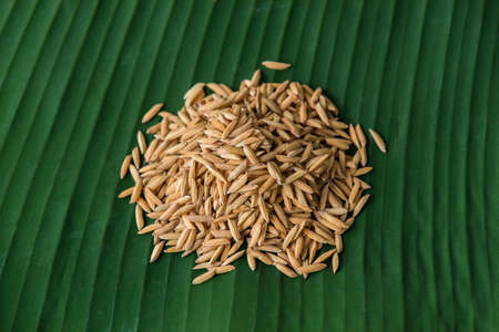 heap of paddy seed on banana leaf