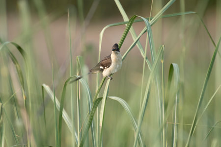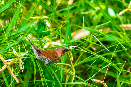 Bronze mannikin bird sitting in stems of grass to eat some fresh seeds