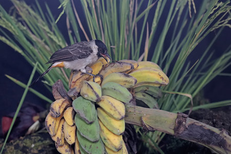 Bird on the banana in the rainforest of Borneo.