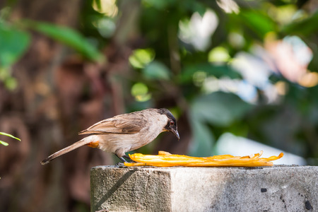 The Sooty-headed Bulbul Pycnonotus aurigaster bird feeding the fruit peel