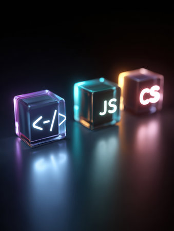 Brightly illuminated cubes display symbols for different programming languages in a dark setting, showcasing a tech-inspired aesthetic.