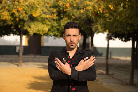 Portrait of young Spanish man, wearing black shirt and jacket, with black handkerchief with red polka dots and castanets, dancing flamenco in the street. Concept art, dance, culture, tradition.