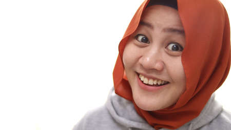 Happy Asian muslim woman smiling cheerful while looking at camera, studio shot over white background