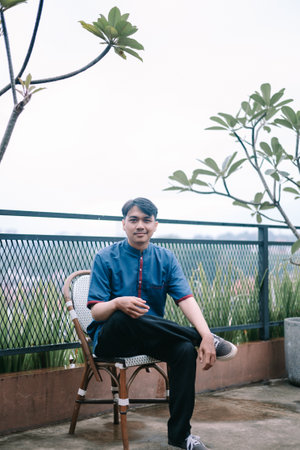 A young man in a stylish outfit sits on a chair on a terrace, looking thoughtfully at the distance. The scene blends urban elements with surrounding natural foliage, creating a tranquil and contemplative atmosphere.