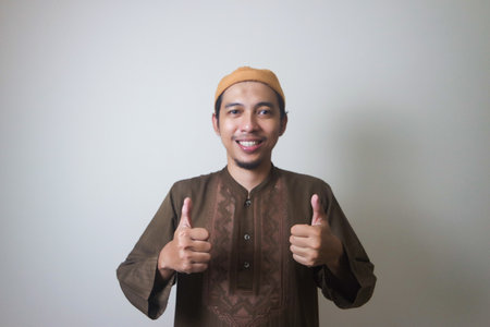 Portrait of attractive Asian muslim man in white shirt showing thumb up, good job hand gesture. Isolated image on gray background