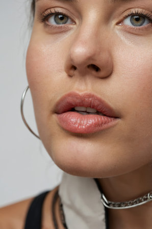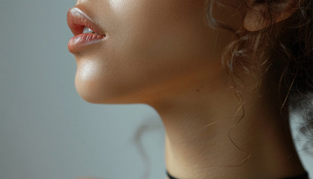 A close-up of a Caucasian woman wearing minimal shin with soft light and lips in the foreground, generated by AI. High quality photo