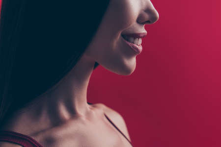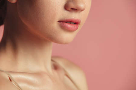 Female chin close up side view. Beauty shot for spa salon. Closeup portrait beauty woman. Natural lip close up. Sexy and full lips. Clean skin