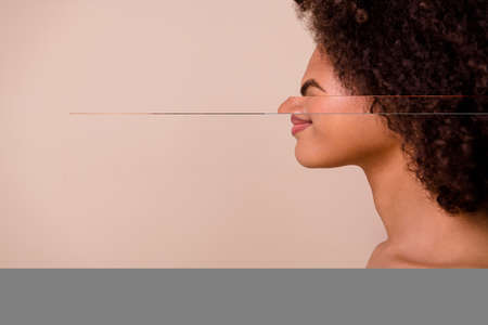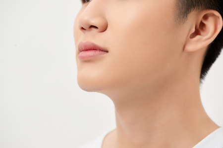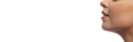 Cropped portrat of female face, nose, lips, chin isolated over white studio background. Side view. Flyer